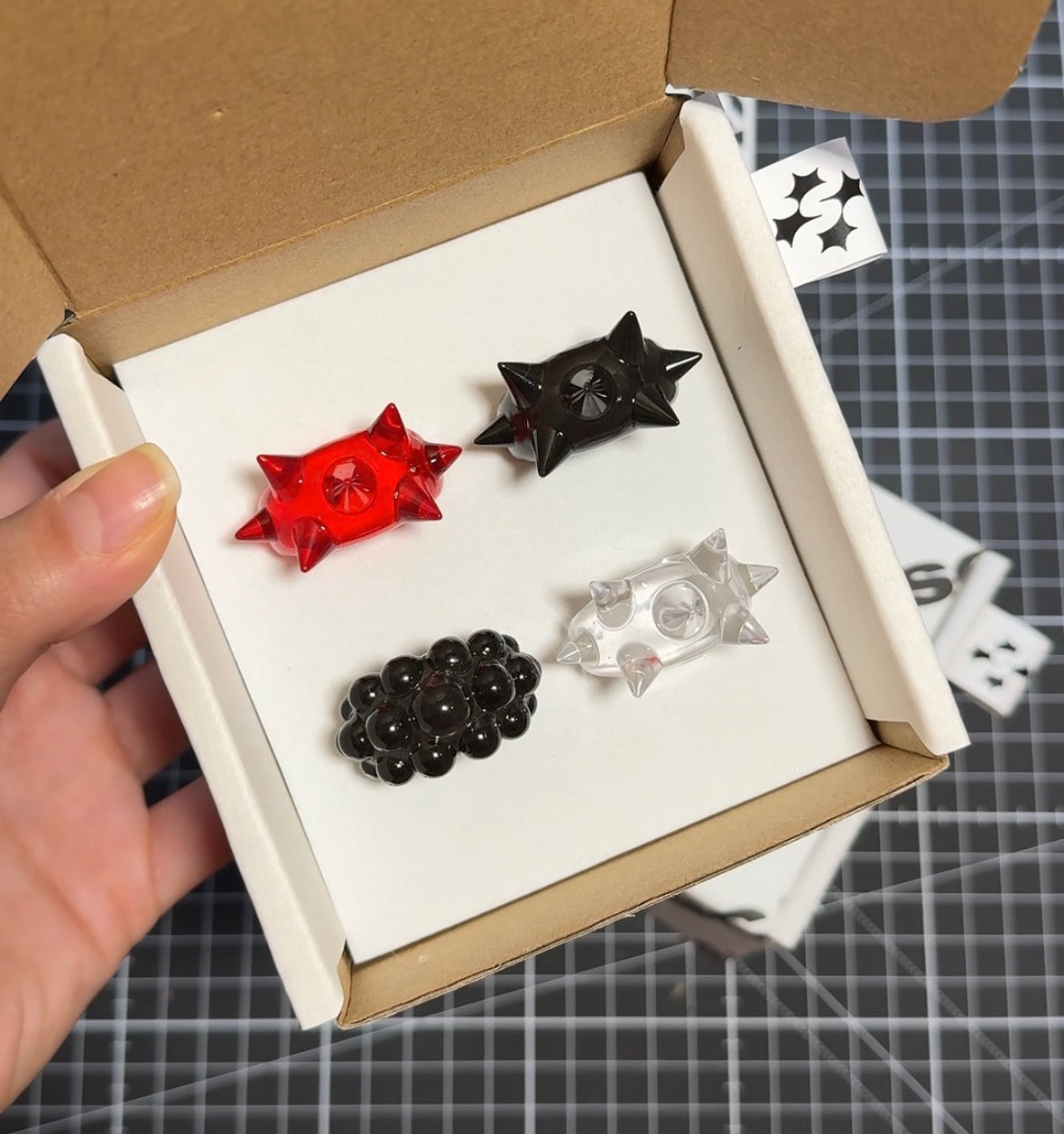 Jelly Thorn es un estallido de energía pura en forma de anillo. Un rojo translúcido, vibrante y casi líquido que captura la luz como un destello en movimiento. Sus puntas geométricas crean un contraste entre delicadeza y fuerza, convirtiéndolo en un accesorio que no acompaña el look: lo domina.