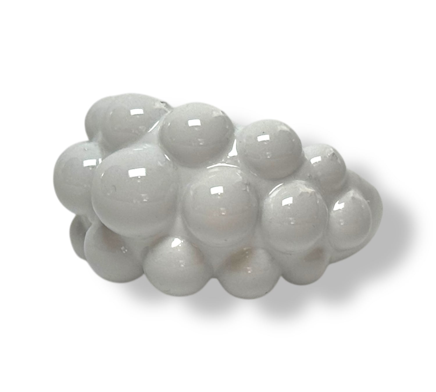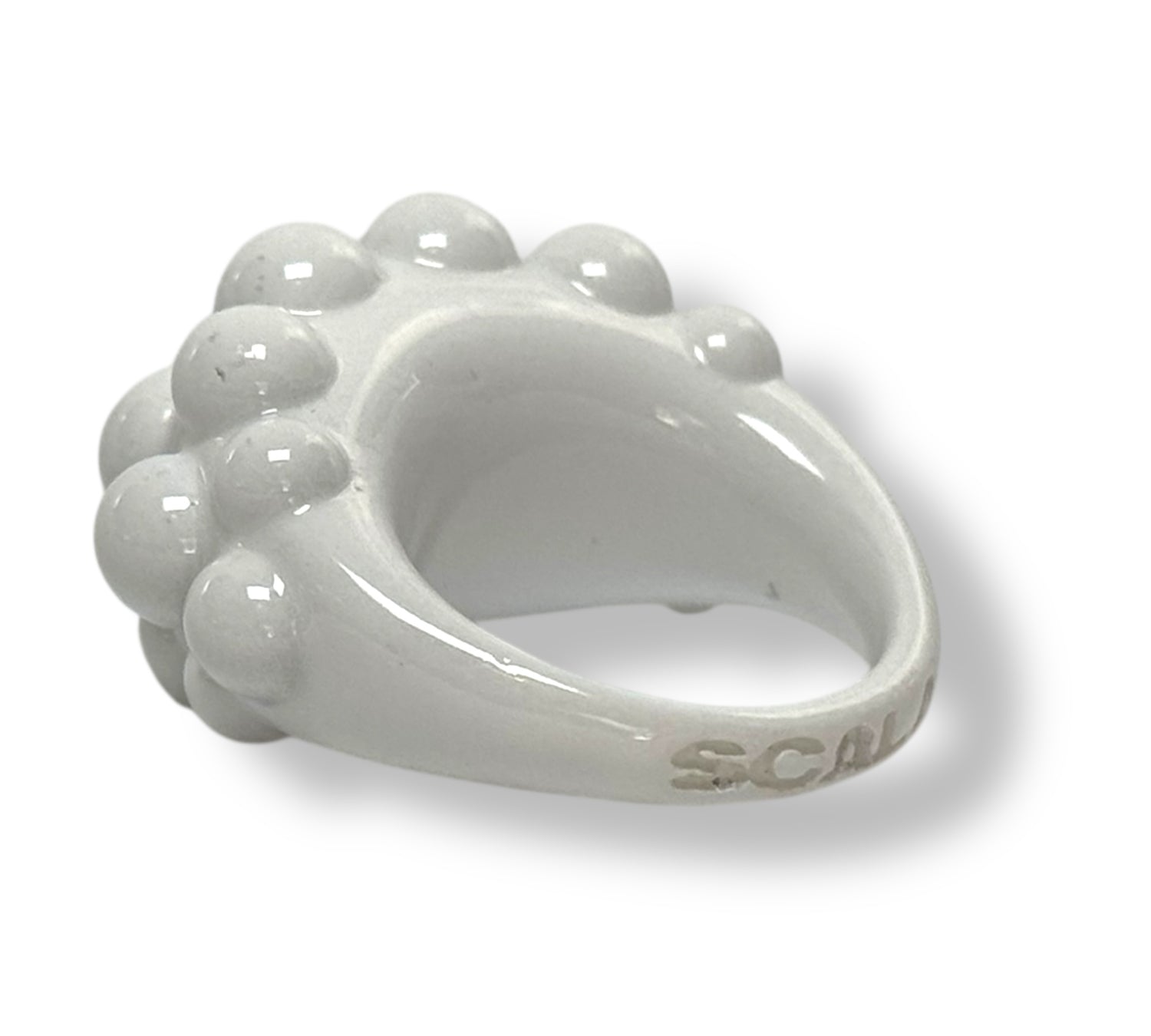 Yuki Tama es un anillo escultórico formado por cúmulos de esferas brillantes, como una pequeña constelación nevada atrapada en la mano. Su acabado blanco puro y su volumen orgánico lo convierten en una pieza que destaca sin esfuerzo.