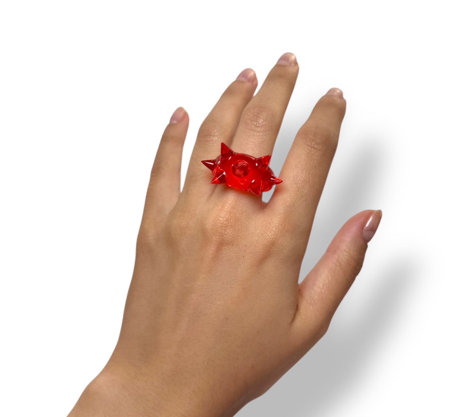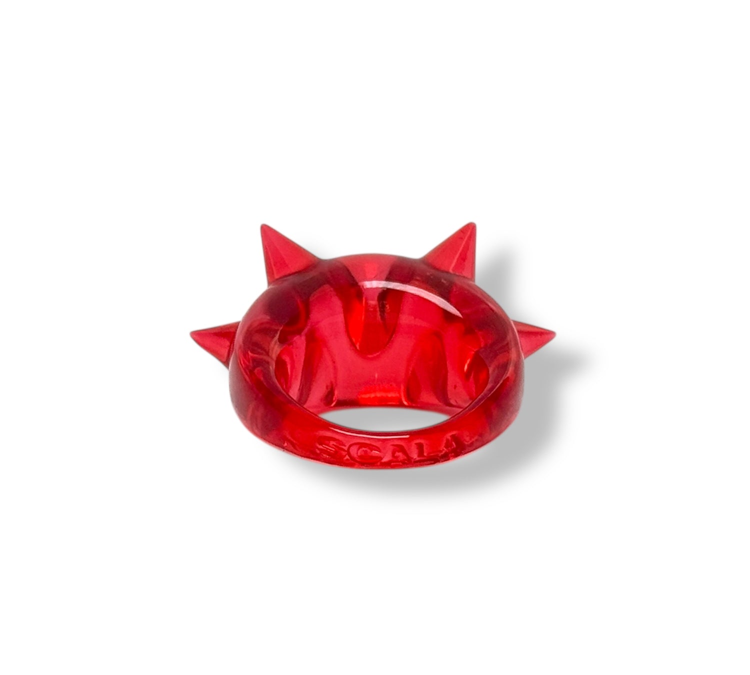 Carminio Impatto es un estallido de energía pura en forma de anillo. Un rojo translúcido, vibrante y casi líquido que captura la luz como un destello en movimiento. Sus puntas geométricas crean un contraste entre delicadeza y fuerza, convirtiéndolo en un accesorio que no acompaña el look: lo domina.